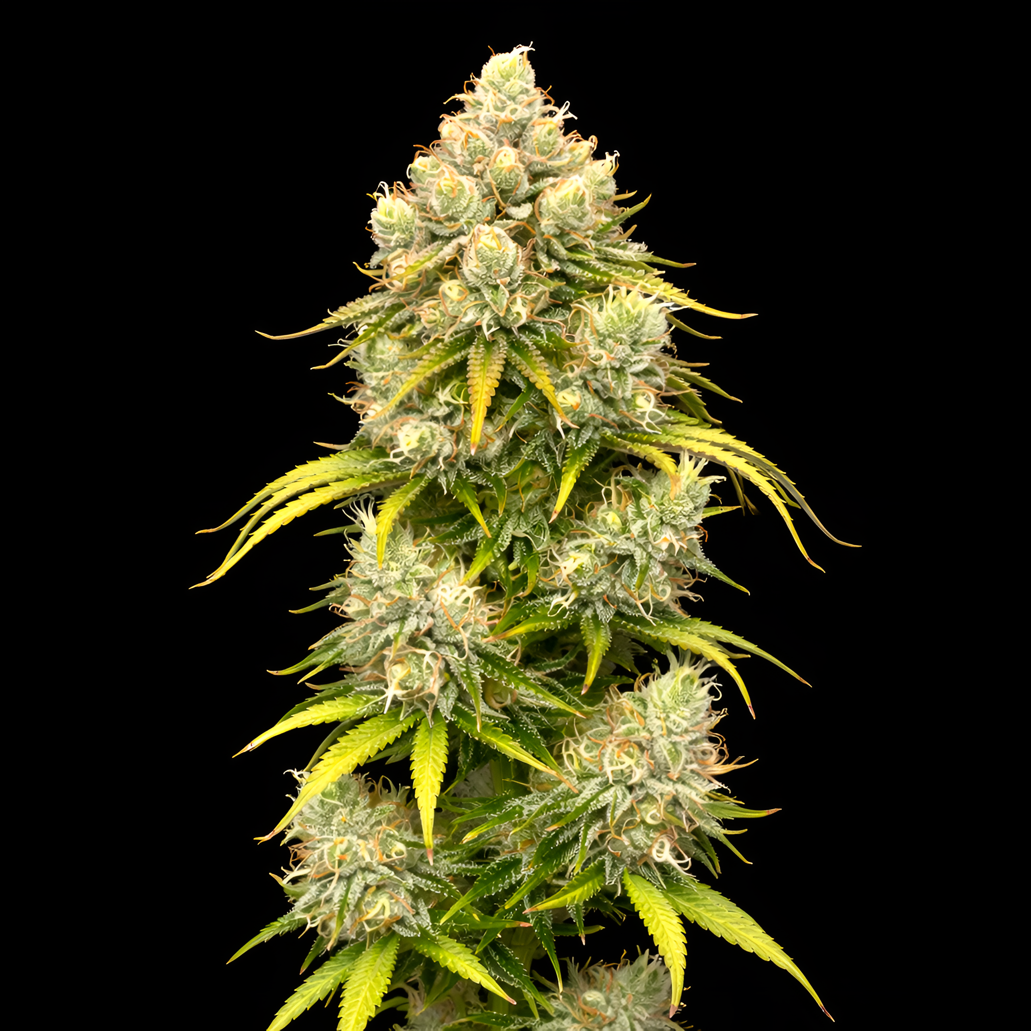 Tropical-indica cross with coloration potential. Intense fruity terpenes, compact structure, fast-medium flowering.