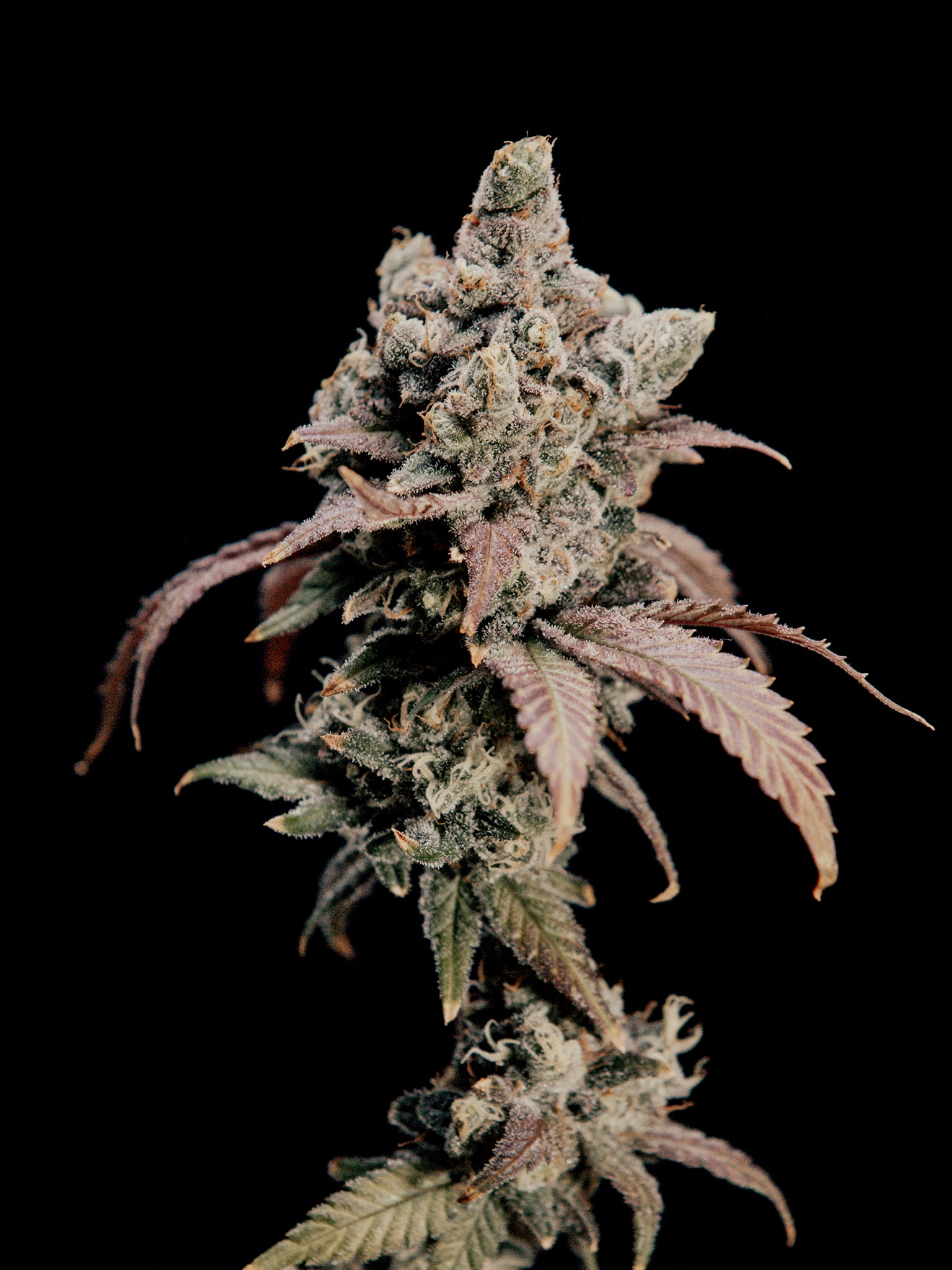 Los cogollos son compactos y densos, recubiertos de tricomas que acentúan sus tonos púrpuras y azulados, creando un aspecto tan atractivo como su aroma.