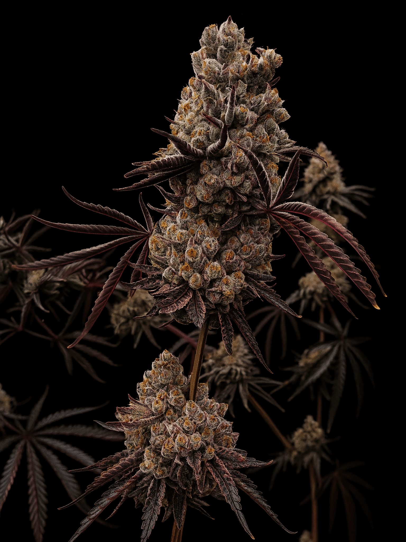 Los cogollos son densos y cubiertos de resina, con una estructura robusta y tonos verdes oscuros salpicados de matices rojizos.
